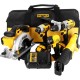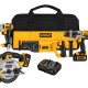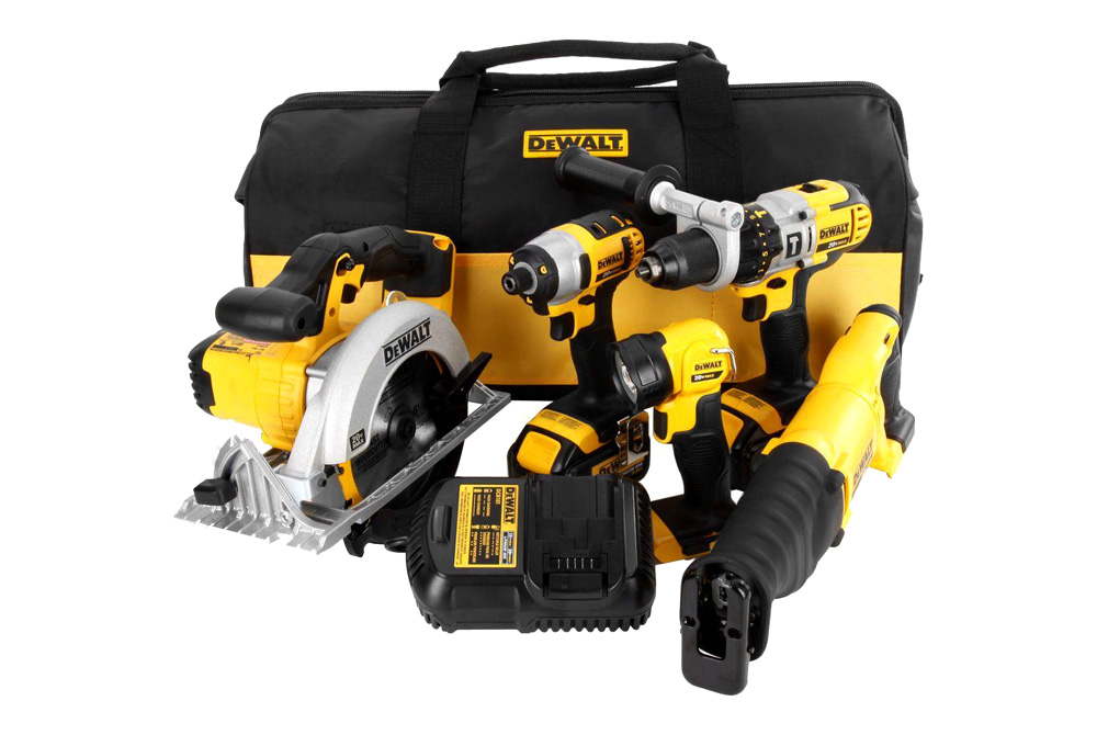 20 Volt Max Li-Ion 5-Tool Combo Kit (3.0 Ah) by DeWalt®. Includes: DCD985 1/2″ Hammerdrill, DCS381 Reciprocating Saw, DCF885 1/4″ Impact Driver, DCS393 6 1/2″ Circular Saw, DCL040 LED Work Light, Two 20V Max Lithium Ion 3.0 Ah Battery Packs, Fast Charger, 360° Side Handle, Belt Hook, Carbide Tipped, Blade, Contractor Bag.
