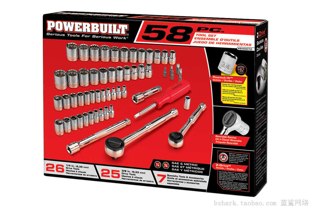 Mechanics Tool Set – 58 Pc by Powerbuilt®. Kit includes: Assorted Dr. 6 and 12 Pt Sockets Set – SAE and Metric (1/4 and 3/8″ Dr. Sockets and Bits, Ratchet, Spinner Handle with Case). Quality Chrome Vanadium Steel Construction. Drop Forged and Heat Treaded for Maximum Durability. Mirror Polished Chrome Finish Prevents Corrosion. Conforms with ANSI Standards.
